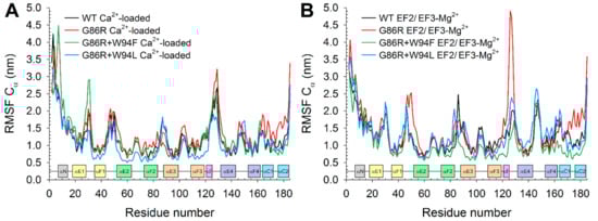 Root-mean square fluctuation calculated over 300 ns MD simulations on Cα of GCAP1 WT (black), G86R (red), G86R+W94F (green) and G86R+W94L (blue) in their Ca2+-loaded (A) and EF2/EF3-Mg2+ (B) forms. Insets show protein secondary structure colored according to Figure 1A.
