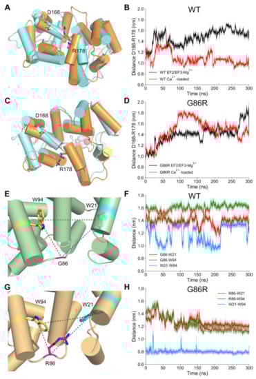 In a previous study on the nanosecond protein dynamics of GCAP1 in different cation-loaded states we identified a specific distance (the distance between D168 and R178) as a convenient descriptor of the “twisted accordion” model describing the typical conformational change that GCAP1 undergoes when switching between different signaling states []. While MD simulations of WT GCAP1 consistently showed a decrease of D168-R178 distance in the Ca2+-loaded state (Figure 8A,B; Table S1), such distance in Ca2+-loaded G86R was almost equal to that measured for EF2/EF3-Mg2+ WT and G86R (Figure 8C,D; Table S1). A close visual inspection of the trajectory of Ca2+-loaded G86R variant suggested that the substitution rearranged the sidechains of the proximal W94 and W21 to a conformation compatible with a double cation-π interaction bridged by R86 with 60° < θ < 90 ° and ϕ ~ 0° (where θ is the angle between the aromatic plane and the cation and ϕ is the angle between the cation, the center of the aromatic ring and an aromatic H atom) angles (Figure 8E,G). Despite a suboptimal geometry, such cation-π interaction could stabilize the hinge region acting as a “lock” between the N- and C-terminal domains. Indeed, relative distances between W21, G/R86 and W94 were smaller for the G86R variant with respect to the WT in both the GC inhibiting (Ca2+-loaded) and activating (EF2/EF3-Mg2+) forms (Figure 8E,H; Table S1). Hence, the cation-π interactions mediated by R86 are necessary to bring the indole rings of W94 and W21 significantly close to each other (Figure 8H), thus enhancing the hydrophobic packing of the two domains. Moreover, G86R mutation seemed to affect the variation in G/R86-W21 and W21-W94 distance upon ion exchange, which resulted to be larger for the G86R variant with respect to the WT, while the variation in G/R86-W94 distance highlighted a significant sign inversion between WT and the pathological mutant.