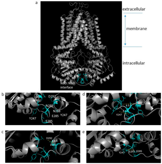 Structural mapping of the highly conserved residues at the NBD:NBD interface. The ABCG2 homodimer cryo-EM structure (a, whole view) with the enlarged view of the NBDs showing the novel constant interface (blue, b). Structural mapping of the mutated NBD interface residues (Y247, E285, N288, and D292) are highlighted as cyan sticks (c–e) depicting the relative positions of the possible interaction residues (<5 Å) at this interface. Figure generated on PyMOL software using PDB: 6ETI; (Jackson et al., 2018) [20].