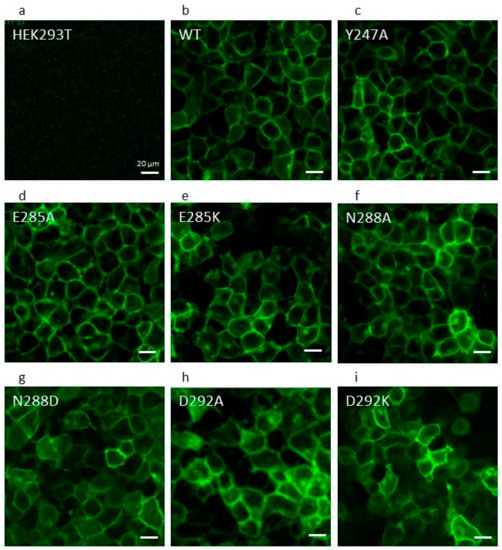 All residue mutations were constructed in an isoform of ABCG2 that is superfolder green fluorescent protein (sfGFP)-tagged to enable localization of the protein and to allow us to normalize functional data by the relative expression level [24]. Following the selection of stable cell lines, we conducted complementary investigations to reassure ourselves that mutant versions were being expressed effectively at the cell surface. Qualitatively, we imaged the stable cell lines on a confocal imaging plate reader visualizing the GFP signal from the sfGFP-ABCG2 fusion proteins. For most transfected cell lines, there was a clear membranous signal in the vast majority of cells (Figure 2), with the exception of N288D, which showed some membrane localized GFP fluorescence in addition to a broader intracellular fluorescence in a significant number of cells (Figure 2g).