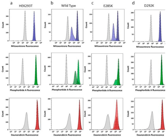 Drug accumulation assays were performed as previous described [24]. Briefly, cells were seeded at 1 × 106 cells/mL in phenol-red free DMEM and incubated with either DMSO (solvent control 0.2% v/v), mitoxantrone (MX, 10 µM), pheophorbide A (PhA, 10 µM), or daunorubicin (DNR, 10 µM) in the presence or absence of the ABCG2 inhibitor Ko143 (1 µM, [32]) at 37 °C for 30 min with occasional agitation. Excess drug was removed by centrifugation prior to a second incubation (37 °C, 60 min) with either phenol-red free DMEM only or phenol-red free DMEM plus Ko143. Wavelength pairs for detection of expression (GFP) or transport (MX, PhA, DNR) were 488/526 nm, 635/670 nm, 355/692 nm, and 490/630 nm, respectively. Daunorubicin fluorescence was separated from GFP fluorescence during data acquisition by compensation.