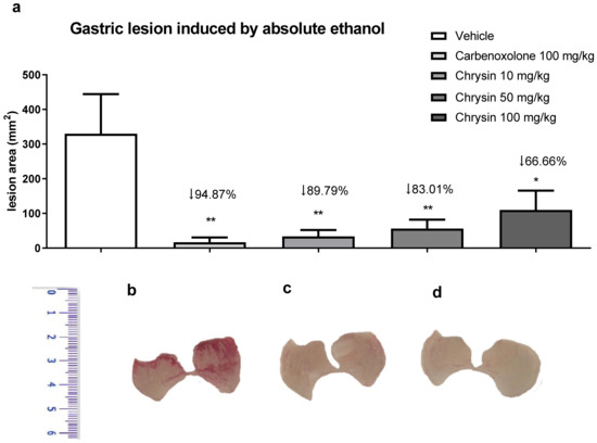 Figure 1. (a) Effect of chrysin in the model of gastric ulcer induced by absolute ethanol. The bar represents the mean ± S.E.M. of lesion area, and statistical significance was determined using the ANOVA followed by Dunnett’s test; * p < 0.05 and ** p < 0.01 compared with the vehicle. Macroscopic photographs of the stomachs of mice treated with (b) vehicle 10 mL/kg, (c) carbenoxolone 100 mg/kg, and (d) chrysin 10 mg/kg.