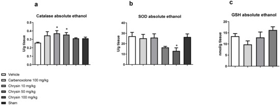 Figure 2. Effect of chrysin on the redox system: (a) catalase, (b) superoxide dismutase, and (c) reduced glutathione in the gastric mucosa of mice with gastric ulcer induced by absolute ethanol. The bar represents mean ± S.E.M., and statistical significance was determined using the ANOVA followed by Dunnett’s test; * p < 0.05 compared with the vehicle.