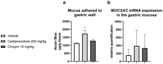 Confirmation that chrysin elevates the mucus production was realized by the quantification of adhered mucus according to [38]. Briefly, animals (n = 6) were fed for 8 h and pretreated with vehicle (saline 10 mL/kg), positive control (carbenoxolone 200 mg/kg) and chrysin (10 mg/kg). All treatments were given by oral gavage. After, one hour of treatment, mice received absolute ethanol in the dose of 0.2 mL/animal. After another hour, the animals were euthanized and the glandular area of the stomach were placed in a solution of Alcian blue (Alcian blue w/v 0.1%, sucrose, 0.16 mol/L, sodium acetate 0.05 mol/L, pH 5.8) for two hours. The stomachs were washed in 0.25 M sucrose solution and kept in 0.5 M magnesium chloride for 2 h while shaking them periodically. After two hours had elapsed from the last procedure, the stomachs were removed, dried, weighed, and discarded. Diethyl ether was added to the solution in the ratio 1:1; after shaking and centrifugation (3874× g) the supernatant was discarded, and the concentration of Alcian blue was measured in a spectrophotometer with λ = 598 nm. The results are expressed as µg of Alcian blue/g of tissue.