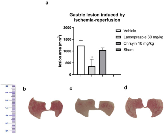 Figure 4. (a) Effect of chrysin in the model of gastric ulcer induced by ischemia-reperfusion. The bar represents the mean ± S.E.M. of lesion area, and statistical significance was determined using the ANOVA followed by Dunnett’s test; * p < 0.05 compared with the vehicle. Macroscopic photographs of the stomachs of mice treated with (b) vehicle 10 mL/kg, (c) lansoprazole 30 mg/kg, and (d) chrysin 10 mg/kg.