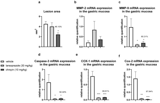 Figure 5. Effect of chrysin in the model of gastric ulcer induced by acetic acid. (a) Macroscopic lesion area and relative quantification of mRNA expression of (b) MMP-2, (c) MMP-9, (d) caspase-3, (e) COX-1, and (f) COX-2 after 7 days of treatment. The bar represents the mean ± S.E.M. of lesion area, and statistical significance was determined using the ANOVA followed by Dunnett’s test; * p < 0.05, ** p < 0.01, *** p < 0.001 compared with the vehicle.