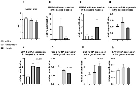Figure 6. Effect of chrysin in the model of gastric ulcer induced by acetic acid. (a) Macroscopic lesion area and relative quantification of mRNA expression of (b) MMP-2, (c) MMP-9, (d) caspase-3, (e) COX-1, (f) COX-2, (g) EGF, and (h) IL-10 after 14 days of treatment. The bar represents the mean ± S.E.M. of lesion area, and statistical significance was determined using the ANOVA followed by Dunnett’s test; * p < 0.05 and ** p < 0.01 compared with the vehicle.