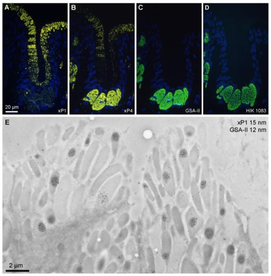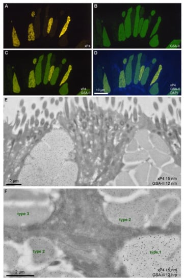 All further technical details for immunofluorescence microscopy and immunoelectron microscopy have been described in detail previously [34,35]. In brief, immunofluorescence microscopy sections were incubated with the primary polyclonal antisera anti-xP1-1 [7] and anti-xP4-1 [1] both diluted 1:50, respectively, the monoclonal antibody HIK1083 (diluted 1:100), and the biotinylated lectin GSA-II (20 µg/mL) simultaneously. Detection of the antisera was with goat anti-rabbit IgG-Cy3 (diluted 1:500) and with goat anti-mouse IgG-FITC (diluted 1:300), whereas detection of biotinylated GSA-II was with mouse anti-biotin monoclonal antibodies (diluted 1:500) as a bridging antibody followed by goat anti-mouse IgG-FITC (diluted 1:300). DNA was counterstained with DAPI (0.1–0.4 µg/mL in H2O), and the sections were mounted in a Mowiol 4.88/glycerol mixture for semi-permanent embedding. Cy3 was imaged using a dedicated Cy3 filter (exciter HQ 545/30, dichroic mirror Q 570 LP and emitter HQ 610/75; F41-007, Chroma Brattleboro, VT, USA; delivered by AHF analysentechnik AG, Tübingen, Germany) resulting in a yellow signal, an FITC filter (HQ 480/40, Q 505 LP, HQ 535/50; F41-001), and a DAPI filter (D360/50, 400 DCP, GG 420 LP; F11-000).