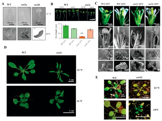 Phenotypic Characterization of Arabidopsis swi3 Mutants Grown at 14 °C. (A) Nomarski image of WT, swi3a and swi3b embryos at 22°C (upper panel) and at 14°C (lower panel). (B) Root phenotype of 14-days-old swi3c line grown at 22°C and 14°C. Root length measurement showed that the swi3c mutant plants exhibited partial reversion of root elongation defect at 14°C. (**): Significantly different at p < 0.01 according to t-test, three biological replicates were used, at least ten plants from each genotype were measured. (C) Appearance of mature flowers (I) and analysis of their organs (II) including stigma (III) and anther (IV) by scanning microscopy in WT and swi3c plants grown at 22°C and 14°C. (D) The rosette of WT and swi3c plants grown at 22°C and 14°C. Scale bar 1 cm. (E) Comparison of 14-days-old WT and swi3d plants grown at 22°C and 14°C.
