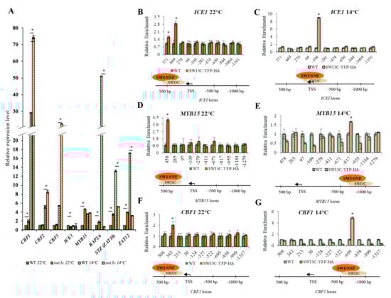 Altered Transcription of Genes Involved in Cold Signaling in the swi3c Mutant. (A) Relative expression levels of genes of cold signaling pathway in wild type and swi3c plants grown at 22°C and 14° C. Plants were in a developmental stage with 12 rosette leaves > 1mm length according to Boyes et al. (2001) []. Asterisks indicate significant difference (*): p< 0.05 according to t-test. (B) SWI3C binding to 5′-UTR region of ICE1 at 22°C and (C) at 14°C. (D) SWI3C binding to the promoter region of MYB15 at 22 °C and (E) at 14°C. (F) Peak position of SWI3C in the CBF1 promoter at 22°C and (G) at 14 °C. The TA3 transposon served as reference gene. Three biological and three technical replicates were used. Plants were in the principal stage with 12 rosette leaves > 1mm length according to Boyes et al. (2001) []. Asterisks indicate significant difference from wild type (*): p < 0.05 according to t-test. Bars refer to SD.