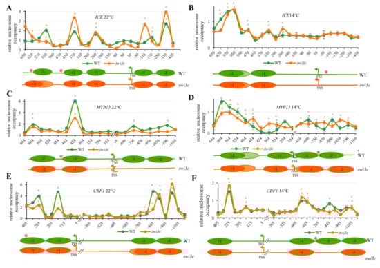 The Effect of SWI3C Inactivation on Nucleosomal Structures of ICE1, MYB15 and CBF1 Genes. (A) Relative nucleosomes occupancy on the ICE1 locus in WT and swi3c plants grown at 22°C and (B) 14°C. (C) Relative nucleosome occupancy on MYB15 in WT and swi3c plants at 22°C and (D) 14°C. (E) Relative nucleosome occupancy on CBF1 in WT and swi3c plants at 22°C and (F) 14°C. Plants were in the principal stage with 12 rosette leaves > 1mm length according to Boyes et al. (2001) []. Three biological and three technical replicates were used. The fraction of undigested genomic DNA amplified for each amplicon was normalized to that of the −73 position of GYPSY-LIKE retrotransposon (At4g07700) as control. Lower panels in each figure section show schematic illustration of nucleosome positioning and dynamics. Red asterisks indicate the localization of SWI3C protein determined by ChIP-qPCR analysis. Dark-color circles indicate positioned nucleosomes, and light colors mark non-positioned nucleosomes. Green and orange asterisks (*) indicate significant (p < 0.05) protection of DNA from MNase digestion in WT or swi3c, respectively.