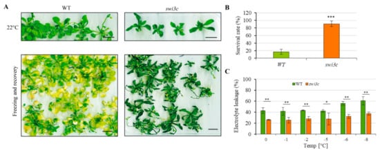 The swi3c Mutant Exhibits Enhanced Freezing Tolerance. (A) swi3c plants are more tolerant to freezing than wild type control. Upper panel: 3-weeks old WT and swi3c plants grown on plates under long day conditions. Lower panel: WT and swi3c plants exposed to freezing and subsequently recovered for seven days under long day conditions at 22°C. (B) The survival rate of wild type and swi3c plants subjected to freezing tolerance assay indicate enhanced freezing tolerance of swi3c plants. (C) swi3c plants exhibit lower electrolyte leakage after freezing damage than WT plants further confirming their enhanced freezing tolerance. Asterisks indicate significant difference from wild type (*): p < 0.05; (**): p < 0.01 (***): p <0.001 according to t-test. Error bars refer to SD.