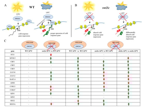 In summary, except for swi3d where only siliques became longer, characteristic developmental defects caused by mutations of SWI3 core subunit genes of SWI/SNF CRCs were partially suppressed at lower temperature. As only the swi3c mutant produced viable homozygous progeny, further analysis of the mechanisms underlying temperature sensitivity of swi3 mutants addressed the question how inactivation of SWI3C gene influences the expression of genes implicated in cold temperature signaling and downstream responses.
