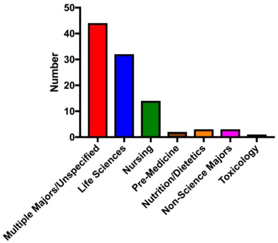 College genomic education is also targeting a variety of student majors (Figure 2). Many of the studies we surveyed did not specify their class’s major composition or the class composition spanned multiple disciplines [50]; however, 32 of the studies focused on the genomic education of life sciences majors, primarily focusing on biology and biochemistry majors [51,52]. It is immensely important that genomics education be emphasized for life science majors, as many of them will pursue healthcare careers and play an important role in disseminating genomic information to their patients [53]. Surprisingly, only a few studies focused specifically on non-science majors. It is possible that studies we surveyed that did not specify their class target audience or composition had an impact on non-science majors taking the class. Educating non-science majors in genomics will be an important avenue to educate students who do not specialize in a science major and prepare them to understand and recognize the importance and influence of genomics in society [54].