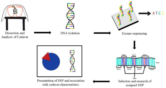 The Anatomy to Genomics (ATG) Start Genetics medical school initiative is another promising method for teaching medical students about genomics [76]. The ATG initiative incorporates first-year anatomy with genomics to teach students about genomic sequencing application and strengthen their understanding in anatomy. As part of the initial study at Lewis Katz School of Medicine at Temple University, DNA samples were taken from the liver, skin, cardiac, and skeletal tissue. Seven different cadavers were dissected, DNA samples were analyzed, and students were asked to research single nucleotide polymorphisms (SNPs) (Figure 3). This ATG program allowed students to draw conclusions about the cadaver’s traits and disease phenotype regarding its genomic profile. Another group performed a similar study on a cadaver who had been diagnosed with idiopathic pulmonary fibrosis [77]. Interestingly, the genomic characterization of the cadaver revealed that the individual could have died from nonspecific interstitial pneumonia rather than idiopathic pulmonary fibrosis as had been suspected by the attending physician. The students found that the cadaver had a SNP (rs35705950) in the promotor region of the mucin glycoprotein MUC5B, which is associated with risk of developing idiopathic pulmonary fibrosis, but the SNP had never been linked to nonspecific interstitial pneumonia. These findings confirm that the SNP in MUC5B promotor is related to the development of lung disease and that the cadaver was genetically predisposed to lung disease. Together, these studies demonstrate that a combined anatomy and genomics approach is advantageous to student learning and furthering clinical research.