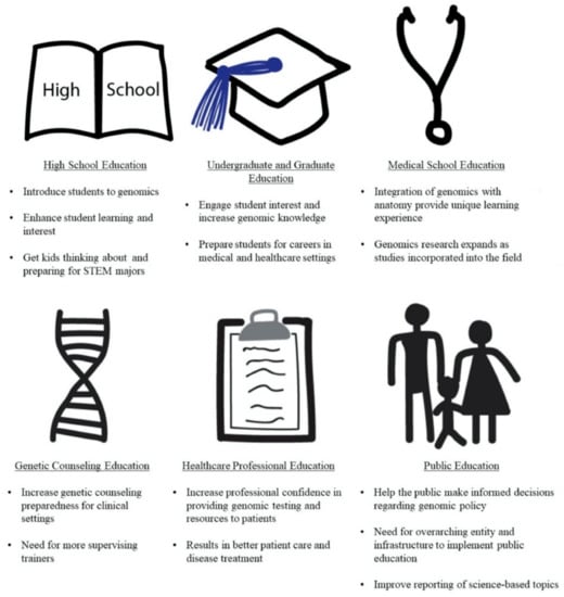 We also have a few suggestions that educators, companies, and governments could utilize to promote genomic education. We recommend that the incorporation of genomics education be included in basic biology classes at the high school and college level in connection with human and medical genetics, since genomics is dependent upon a strong genetic understanding [33]. In regard to medical, graduate, and genetic counseling education, we suggest that educational institutions consider requiring applying students to have taken a genomics-focused or genomics-related course in order to provide a foundational genomic knowledge for incoming students. Genetic counseling programs currently struggle with providing training slots and supervision, therefore, we suggest that funding from either external or internal sources be considered to alleviate the strain on genetic counseling educators [79]. Physicians and healthcare professionals have competing interests and time constraints, so we suggest that genomic education material become more readily accessible through online formats such as email or computer-based modules in order to facilitate continuing genomic education for practicing healthcare providers [97,98]. Education for the public requires the most extensive efforts in providing accessible and pertinent genomic information [50]. As many people have suggested the need for public infrastructure and leadership over genomic education, we suggest that a public organization such as the Global Genomics Nursing Alliance (G2NA) be organized by a government entity such as the Science Education Division of the National Institute of Health to fill these educational gaps [58]. We also suggest that, with the increased use of direct-to-consumer genetic testing, these companies be required to provide online educational modules to increase public genomic education and improve public healthcare decisions [99]. In conclusion, these suggestions should provide avenues for multiple platforms for integrating and strengthening genomic education at academic and non-academic levels.