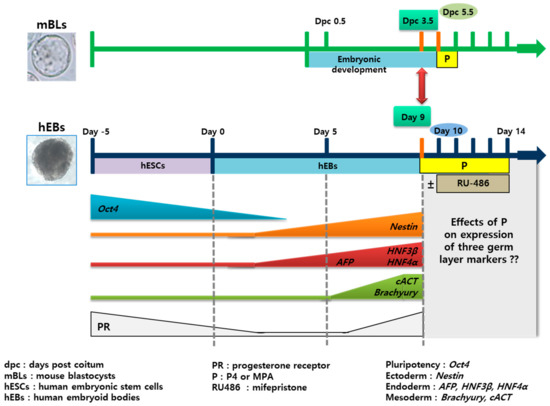At the early gastrulation stage, the embryos demonstrate all three germ layers. The differentiation duration was 14 days from undifferentiated hES to day 9 hEB that expressed all three germ layer markers and were regarded as corresponding to the stage of gastrulating mBLs (dpc 3.5). The in vitro differentiation of hEBs was assumed to take approximately five times as long as that of mBLs. Thus, different P4 or MPA treatment duration was applied as such in this experimental design (Figure 1).