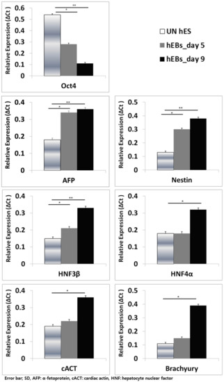 To characterize the stage of hESC and hEB differentiation, the expression of pluripotency and three germ layer-specific genes on undifferentiated hESCs (UN hES), day 5 hEBs, and day 9 hEBs was evaluated. Oct4 (undifferentiated, pluripotency marker) was expressed at the highest level on hESCs, decreased on day 5 hEBs, and further down-regulated on day 9 hEBs. The expression of Nestin (ectoderm), α-fetoprotein (AFP, early endoderm), HNF3β, HNF4α (endoderm), and cACT, Brachyury (mesoderm) was low in hESCs, and increased during differentiation and showed the highest levels on day 9 hEBs (* p < 0.05) (Figure 2).