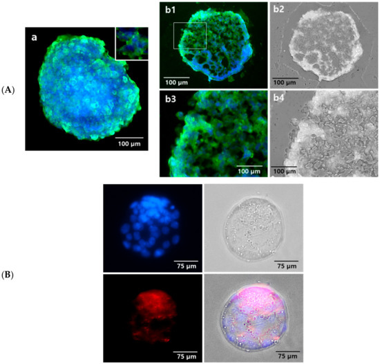 The expression and localization of PRs on the suspension-cultured hEBs were evaluated and confirmed. The existence of PRs was confirmed on the surface of hEBs (Figure 3Aa) and was also observed at the cross-sectioned hEBs as green fluorescence (Figure 3Ab1–b4). These data confirmed the location of PRs both on the inner and outer regions on day 9 hEBs. PR expression was also confirmed on freshly isolated mBLs (Figure 3B).