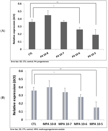 Since its expression showed the earliest up-regulation among the evaluated genes (Figure 2), the AFP gene was selected to test the effects of various P4 or MPA concentrations. The serum P4 levels of the secretory phase and early pregnancy are known to be less than 100 nM (10−7 M) [26]. After treatment with P4 or MPA at 10−8 M, 10−7 M, 10−6 M, and 10−5 M, the expression of AFP was quantitatively evaluated. Supraphysiological levels such as 10−6 M, 10−5 M showed significant down-regulation of AFP expression (* p < 0.05 and **p < 0.01, respectively) in P4 or MPA-treated groups (Figure 4). Thus, 10−7 M was selected as a treatment concentration for the following hEBs and mBLs experiments.
