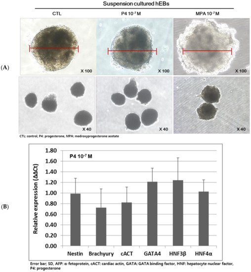 The design of the experiment is represented in Figure 1. The hEBs derived from hESCs were cultured for nine days in suspension and then treated with P4 or MPA at 10−8 M, 10−7 M, 10−6 M, and 10−5 M for five days. In P4 or MPA-treated samples, RU486 was treated for four days in order to check if the observed P4 or MPA-specific effect was negated. Mouse BLs (mBLs) were treated with P4 or MPA at 10−7 M for 24 h, and the expression of three germ layer genes was assessed.