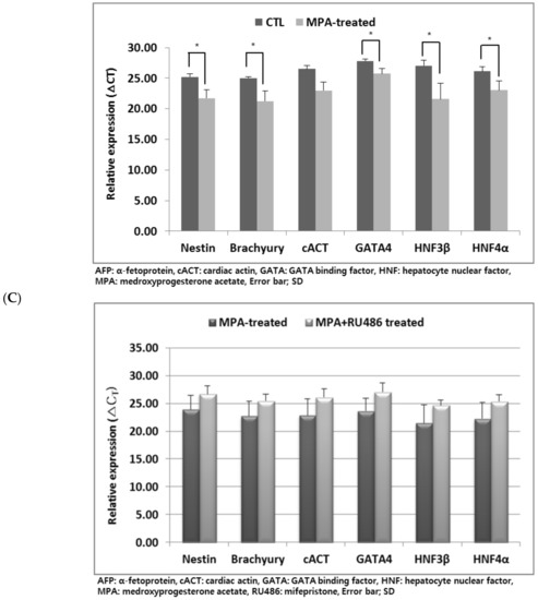 A significantly lower expression of embryonic three germ layer genes, such as Nestin, HNF-3β, HNF-4α, GATA4, cACT, and Brachyury, was observed on the in vitro cultured hEBs after MPA treatment at 10−7 M for five days. The down-regulated expression of tested genes was not observed when RU486 was added to MPA treatment. In mouse gastrulation stage embryos, the expression of three germ layer genes was significantly down-regulated after MPA treatment at 10−7 M for 24 h, which showed a similar pattern to that observed from hEBs. In contrast, this inhibitory effect was not observed in P4-treated groups.