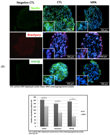 Effects natural progesterone and synthetic progestin on the expression of three germ layer genes in day 9 human embryoid bodies (hEBs). (A) The morphology did not differ according to the progesterone (P4) treatment at 10−7 M for 5 days. The medroxyprogesterone acetate (MPA)-treated hEBs were unformed and became loose. The red bar of each picture indicates the diameter of formed EBs. (B) P4 treatment at 10−7 M for 5 days did not alter the expression of germ layer genes. (C) MPA treatment at 10−7 M for 5 days induced down-regulated expression of all tested genes (* p < 0.05, respectively, CTL: untreated hEBs), upper panel. RU486 treatment negated the effects of MPA (CTL: MPA-treated hEBs), lower panel. (D) Immunostaining of three germ layer genes on the hEBs treated with MPA. Counts of positively stained cells were evaluated and compared between the groups (* p < 0.05).