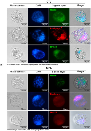 hEB-deparaffinized slide or fixed mouse embryos were washed with PBS. After rinsing with PBS, embryos were permeabilized in PBST [PBS containing 0.05% tween 20 (Sigma-Aldrich, St. Louis, MO, USA)] for 30 min at room temperature and blocked in blocking butter, which consisted of PBS containing 3% bovine serum albumin (BSA, Sigma-Aldrich, St. Louis, MO, USA) and 0.3% Triton X-100 (Sigma-Aldrich, St. Louis, MO, USA). Primary antibodies, rabbit anti-human Progesterone Receptor (PR) (ab32085, Abcam, Cambridge, MA, USA), mouse anti-PR (ab2765, Abcam, Cambridge, MA, USA), mouse anti-human Nestin (ab22035, Abcam, Cambridge, MA, USA), rabbit anti-human and mouse Brachyury (ab20680, Abcam, Cambridge, MA, USA), goat anti-human HNF3β (AF2400, R&D Systems, Minneapolis, MN, USA), mouse anti-mouse Nestin (ab6142, Abcam, Cambridge, MA, USA), and rabbit anti-mouse HNF3β (ab108422, Abcam, Cambridge, MA, USA) were diluted 1:100 in blocking buffer and samples were incubated at 4 °C overnight. Then, they were rinsed three times in PBST for ~15 min each. Secondary antibodies, Alexa FluorTM 488 goat anti-rabbit (A11008), Alexa FluorTM 488 goat anti-mouse (A11001), Alexa FluorTM 488 rabbit anti-goat (A11078), Alexa FluorTM 594 rabbit anti-goat (A27016), and Alexa FluorTM 594 goat anti-mouse (A11005, all purchased from Molecular Probes, Waltham, MA, USA), were diluted 1:500 in blocking buffer and samples were incubated in secondary antibody for 1 h at room temperature. Samples were then rinsed three times in PBST and incubated briefly with 4′,6-diamidino-2-phenylindole, dihydrochloride (DAPI, D1306, Molecular Probes, Waltham, MA, USA) reagent. For negative control, only secondary antibodies were treated to samples, as described above. Fluorescence images were captured using EVOS-FL fluorescence microscope (Thermo Fisher Scientific, Waltham, MA, USA). Specific antibodies used for immunostaining are summarized in Table 1. To measure the positive portion, DAPI and fluorescence-positive cells were counted, and the percentage of positive cells was calculated (Figure 5D).