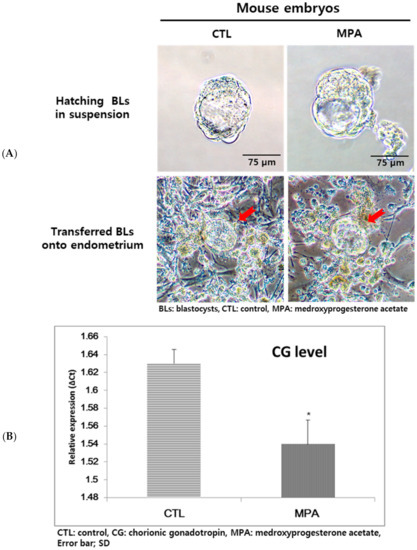 Chorionic gonadotropin (CG) expression of mouse embryos transferred onto autologous endometrial cells. (A) Mouse embryos transferred onto primary in vitro cultured endometrial cells did not show any different morphology according to MPA treatment at 10−7 M. The red arrow indicated mBLs. (B) The expression of CG was down-regulated in the MPA-treated group (* p < 0.05).