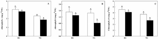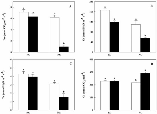 3.2. Discrepancy of Morphology and Photosynthesis between NG and RG Cucumber Seedlings