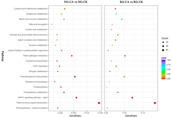 2.6. Functional Classifications of DEGs Response to CA Stress