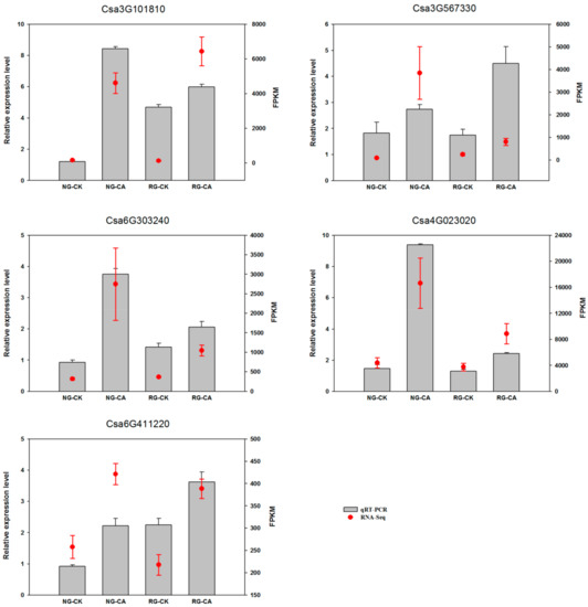 2.9. Validation of mRNA-Seq by qRT-PCR