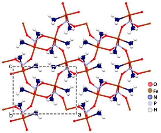 The channels along the b axis are fully occupied by the ammonia molecules in the crystal packing of Fe(NH3)2PO4.