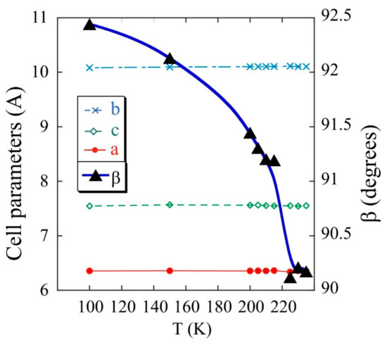 The evolution of the cell parameters with temperature was analysed from the sequential refinement of the profiles obtained from the single-crystal X-ray diffraction to selected temperatures, between room temperature and 2 K, by using the Rietveld method and the FullProf program. The orthorhombic crystal changes towards monoclinic P21/n structure when the temperature is lowered down to 240 K. The cell parameters, a = 6.355 Å, b = 10.097 Å and c = 7.581 Å, remain constant up to 2 K. The angle β of the unit cell varies from 90°, at 250 K, to 92.5°, at 100 K (see Figure 4). Although symmetry is lost, the basic structural characteristics are kept because of strong hydrogen bonds.