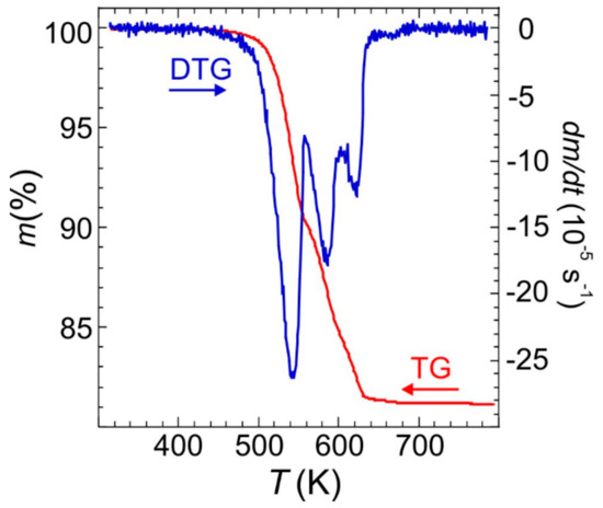The in situ HT-PXRD (300–1100 K) patterns suggest, in Figure 5, that the sample is stable up to 440 K. The ammonium evacuation finishes at ca. 680 K. After this temperature, an intermediate phase occurs until ca. 940 K, when the α-FePO4 is formed [14].