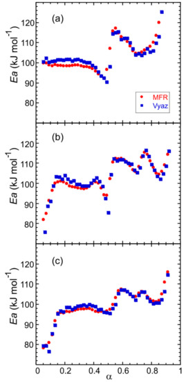 For the large crystals, in the 0.05 < α < 0.50 conversion range, the apparent activation energy E is about 100 kJ mol−1, concerning the first step of ammonium loss. For 0.50 < α < 0.70, the values obtained for E are about 110 kJ mol−1, which correspond to the second step of ammonium loss and finally, in the 0.70 < α < 0.90 conversion range, E is about 100 kJ mol−1, related to the third step of ammonium loss. The shape of the E − α curves is slightly less smooth in the second and third α-range for the polycrystalline samples (Figure 7b,c). The difference may be due to a partial overlap of the last two ammonium losses. The values of the activation energy computed by the MFR and Vyaz methods hardly show variations.