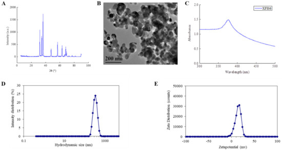 (A) X-ray diffractograms (XRD) pattern of nano-ZnO; (B) the transmission electron microscopy (TEM) image of nano-ZnO (code XFI06); (C) the UV-visible spectra of 100 mg L−1 nano-ZnO; (D) the hydrodynamic size distribution of nano-ZnO; (E) the zeta potential distribution of nano-ZnO.
