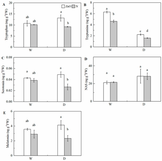 Concentrations of tryptophan (A), tryptamine (B), serotonin (C), NAS (D), and melatonin (E) in maize leaves as affected by nano-ZnO and drought stress. Data are reported as mean ± SE (n = 3). Different small letters indicate significant difference at p < 0.05 level. NAS, N-acetylserotonin; ZnO, nano-ZnO treatment; N, non-ZnO treatment; W, normal water supply; D, drought stress.