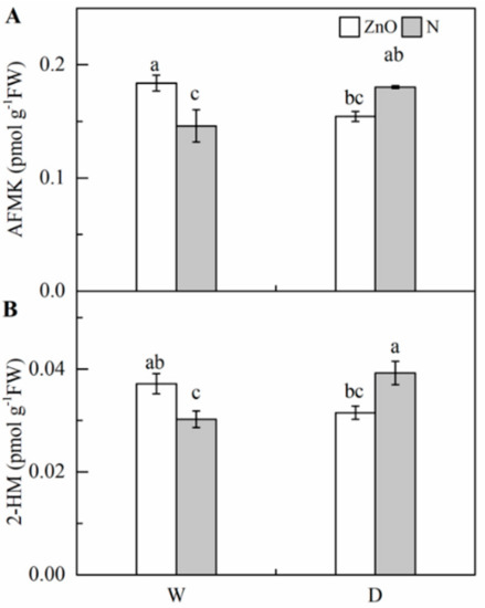 Concentrations of AFMK (A) and 2-HM (B) in maize leaves as affected by nano-ZnO and drought stress. Data are reported as mean ± SE (n = 3). Different small letters indicate significant difference at p < 0.05 level. 2-HM, 2-hydroxymelatonin; AFMK, N1-acetyl-N2-formyl-5-methoxyknuramine; ZnO, nano-ZnO treatment; N, non-ZnO treatment; W, normal water supply; D, drought stress.