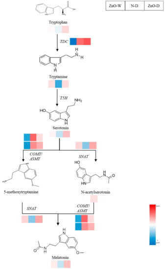 Modifications of relative expression of related genes and concentrations of metabolites involved in melatonin synthesis in maize leaf induced by nano-ZnO and drought stress. Compared with N-W, the differences in genes expression and intermediate concentrations level for a given enzyme under ZnO-W, N-D and ZnO-D, were log-normalized and converted to a color scale. It was reorganized after analysis with the PageMan software. Up-regulation and down-regulation were indicated in increasing red and blue, respectively. The unaltered level was indicated in white. TDC, tryptophan decarboxylase; ASMT, N-acetylserotonin O-methyltransferase; COMT, caffeic acid O-methyltransferase; SNAT, serotonin N-acetyltransferase; ZnO, nano-ZnO treatment; N, non-ZnO treatment; W, normal water supply; D, drought stress.