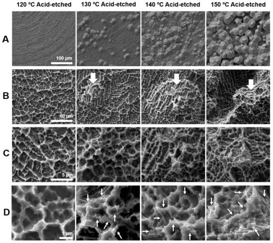 Figure 1 shows the morphology of acid-etched titanium surfaces at different temperatures of 120, 130, 140, and 150 °C evaluated by scanning electron microscopy (SEM). The greatest contrast was seen in the lowest magnification images (Figure 1A). Titanium surfaces acid-etched at 120 °C showed no recognizable structures at lowest magnification, whereas those etched at other temperatures showed spike-like projecting structures across the surface. The sizes of the spikes were in the meso-scale and ranged from 10 to 80 μm according to the SEM images. The density and size of the spikes were greater on titanium surfaces etched at higher temperatures. Higher magnification images clearly showed the spikes more vividly on all surfaces (white arrowheads in B) except for the one etched at 120 °C; moreover, the surface of the spikes began to show microroughness as in other areas of the titanium (Figure 1B). Even higher magnification images configured the microroughness as a compartmental structure consisting of peaks and valleys (Figure 1C). This microrough feature was in common for all surfaces, including the one etched at 120 °C. The highest magnification images revealed nano-scale structures exclusively formed on titanium surfaces etched at 130 °C or higher (Figure 1D). Nano-scale structures were not observed on 120 °C acid-etched titanium, even at the highest magnification. Nanofeature was polymorphic, including but not limited to nano-ridge, nano-nodule, nano-pillar, and nano-compartmental structures (white arrowheads in Figure 1D). Thus, we discovered new titanium surfaces with distinct morphology simultaneously at three different levels of meso-, micro-, and nano-scales.