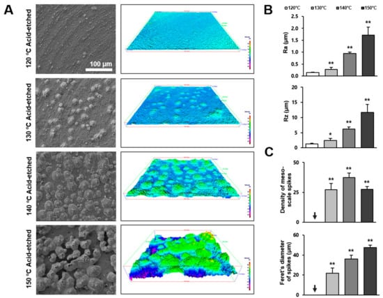 Figure 2B,C shows the quantification of roughness values. The average roughness (Ra) increased in correlation with the acid-etching temperature. The increase was more significant when the temperature rose from 130 to 140 °C. The Ra of the 140 °C- and 150 °C-acid-etched surfaces was 6 and 12 times greater, respectively, than the 120 °C-acid-etched surface. The peak-to-valley roughness (Rz) also increased in correlation with temperature. Supporting the observation mentioned earlier, the density of the meso-scale spikes increased with the acid-etching temperature and plateaued at 140 °C, whereas their Feret’s diameter continued to increase until the temperature reached 150 °C. The sizes of the meso-spikes ranged from 20 to 50 μm according to the Feret’s diameters of the spikes, confirming the generation of meso-scale structures.
