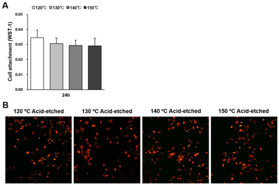 Initial attachment of cells was evaluated by measuring the number of cells attached to titanium disks after 24 h of incubation using WST-1-based colorimetry (WST-1; Roche Applied Science, Mannheim, Germany). The culture well was incubated with 100 µL WST-1 reagent at 37 °C for 4 h. The amount of formazan produced was measured using an enzyme-linked immunosorbent assay (ELISA) plate reader (Synergy HT; Bio Tek Instruments, Inc., Winooski, VT, USA) at 450 nm.