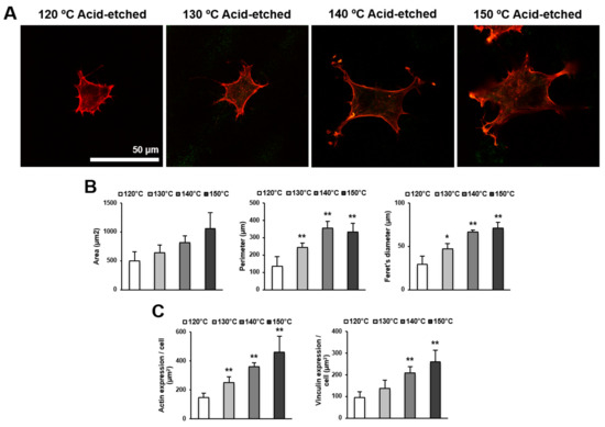 Representative confocal microscopy images of the spreading behavior of osteoblasts 24 h after seeding on acid-etched titanium discs at different temperatures. (A) The cells were stained with rhodamine phalloidin for actin filaments (red) and anti-vinculin antibody for vinculin (green). Scale bar = 50 μm. (B) Histograms for cytomorphometric parameters measured from the images. (C) The expression levels of actin and vinculin were semiquantified using the confocal microscopy images. Data are mean ± standard deviation (n = 5) for panels (B,C). * p < 0.05, ** p < 0.01, with a statistically significant difference when compared to the 120 °C acid-etched surface.