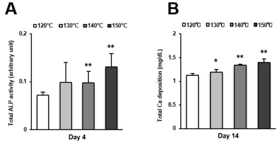 Osteoblast differentiation on titanium surfaces etched at different temperatures. (A) Alkaline phosphatase (ALP) activity at day 4, colorimetrically quantified and standardized relative to cell number. (B) Total calcium deposition at day 14, as measured using a colorimetry-based method. Each value represents the mean ± standard deviation of triplicate experiments (n = 3). * p < 0.05, ** p < 0.01, with a statistically significant difference when compared to the 120 °C acid-etched surface.