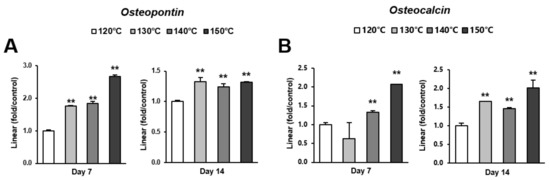 Gene expression levels of selected markers quantified via real-time qPCR. The osteogenic markers (A) osteopontin and (B) osteocalcin were analyzed. Total RNA was isolated at 7 and 14 days using osteoblastic cell cultures on titanium surfaces acid-etched at different temperatures. Relative expression levels (2-ΔΔCt values) of the genes of interest were normalized to that of the housekeeping gene glyceraldehyde-3-phosphate dehydrogenase (Gapdh). Each value represents the mean ± standard deviation of triplicate experiments (n = 3). ** p < 0.01, with a statistically significant difference when compared to the 120 °C acid-etched surface.