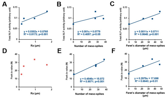 Correlation between differentiation ability or push-in value and each surface roughness parameter. Total ALP activity after incubation for 4 days plotted against the average roughness (Ra) of the acid-etched titanium surfaces, showing a significant linear correlation (A). Number of meso-spikes (B) and Feret’s diameter of meso-spikes (C) plotted against total ALP activity at day 4, showing a significant linear correlation between ALP activity and number of meso-spikes (B) and between ALP activity and Feret’s diameter of meso-spikes (C). Push-in value plotted against Ra, showing no significant correlation (D). Number of meso-spikes (E) and Feret’s diameter of meso-spikes (F) plotted against push-in value, showing a significant linear correlation between push-in value and number of meso-spikes (E) and between push-in value and Feret’s diameter of meso-spikes (F).