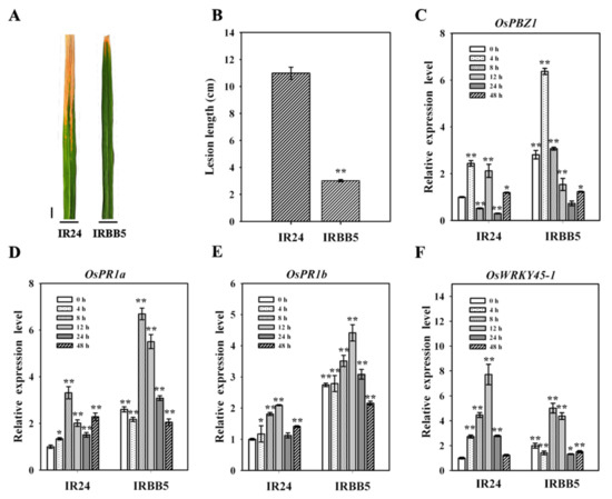 Comparison of bacterial blight responses of IRBB5 and IR24. (A) Disease symptom during Xoo inoculation of the IRBB5 and IR24. The indicated rice genotypes were inoculated with Xoo strain PXO86 at tillering stage in the planting field. (B) Lesion lengths in IRBB5 and IR24 at 14 days post inoculation with Xoo strain PXO86. (C–F) Expression pattern of four published defense-responsive genes in IRBB5 and IR24 under Xoo strain PXO86 treatment. RNA was extracted at the indicated time points for qRT-PCR experiments, and the relative expression values of all samples were normalized by quantifying the miRNAs transcription of IR24 0 h samples. Scale bar, 1 cm. Bars represent mean ± standard deviation (n = 3 independent biological replicates). Asterisks indicate a statistically significant difference (** p < 0.01, * p < 0.05).