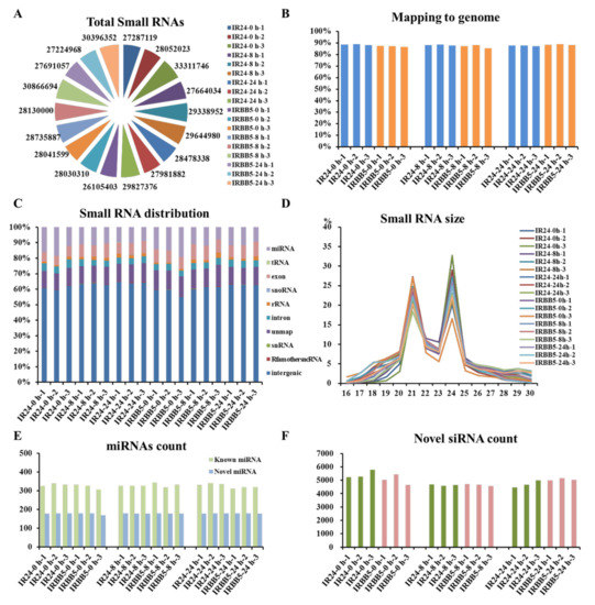 Profiling of small RNA sequencing in two rice genotypes inoculated with Xoo strain PXO86. (A) Total clean reads distribution in libraries from different time point treatment with Xoo strain PXO86. (B) The mapping percentage of the clean reads in 18 sequenced samples. (C) The classification distribution of the sequenced small RNA for every rice small RNA library. (D) Length distribution and abundance of the small RNAs in each library. (E) The statistic of known and candidate miRNAs in disparate sample. (F) The distribution number of predicted siRNAs in disparate sample. ‘IR24′ represents the rice cultivar ‘IR24′; ‘IRBB5′ represents the rice cultivar ‘IRBB5′; ‘0 h’, ‘8 h’ and ‘24 h’ represents separately the treatment time point with Xoo strain PXO86; ‘−1′, ‘−2′ and ‘−3′ means the different biological replicate, respectively; nt, nucleotide.