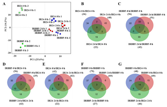 The overview of the miRNAs changes in IR24 and IRBB5. (A) Principle component analysis of detected miRNAs in small RNA sequencing data. Green, blue and red box denotes samples at 0, 8 and 24 h after treatment with Xoo strain PXO86 in IR24, respectively. Similarly, green, blue and red dot denotes samples at 0, 8 and 24 h after treatment with Xoo strain PXO86 in IRBB5, respectively. The samples at different time point have three biological replicates. (B–D) Venn diagrams of up-regulated differentially expressed miRNAs (DE miRNAs) in IRBB5 and/or IR24 after PXO86 strain infection. (E–G) Venn diagrams of down-regulated DE miRNAs in IRBB5 and/or IR24 after PXO86 strain infection.